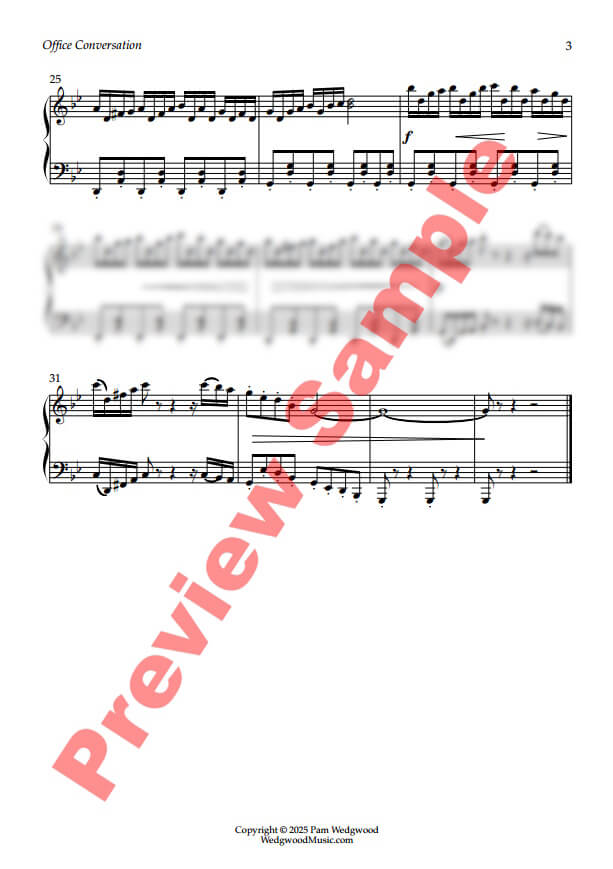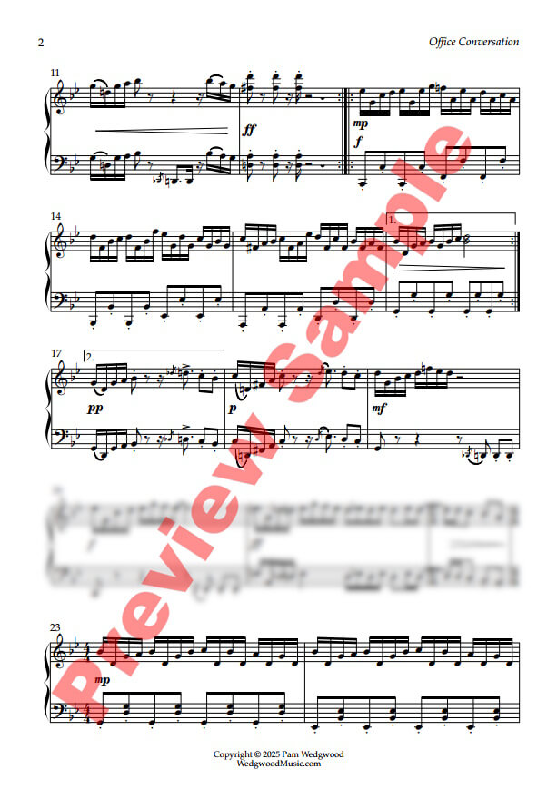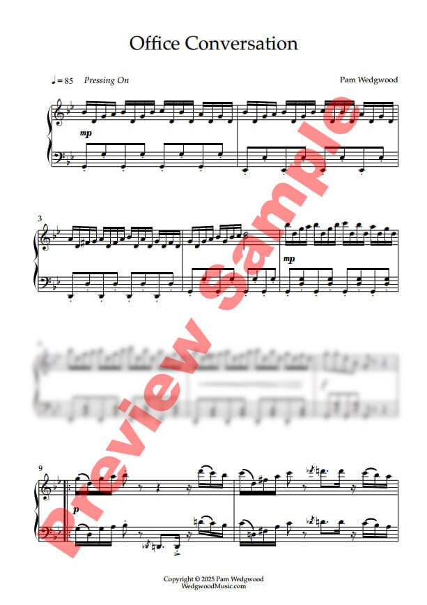 Step into the lively world of workplace chatter with Office Conversation, a sparkling solo piano piece from Pam Wedgwood’s Conversations suite. Perfect for intermediate players, this Neo-classical miniature captures the hustle, bustle, and quick-fire exchanges of a busy office – without the paperwork!
